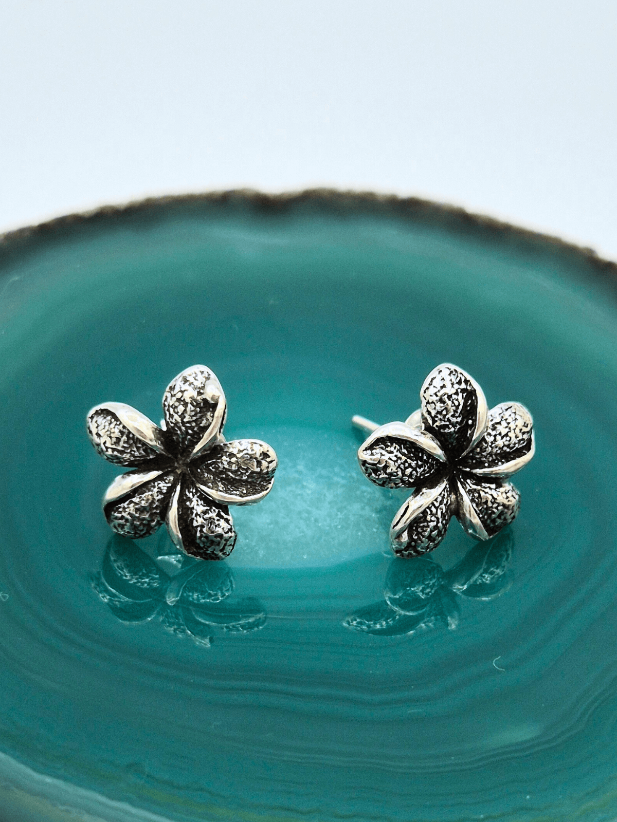 Cercei mici din argint 925, realizați manual în Bali, în forma delicată a florii Frangipani. O amintire parfumată de vară tropicală, purtată în fiecare zi.